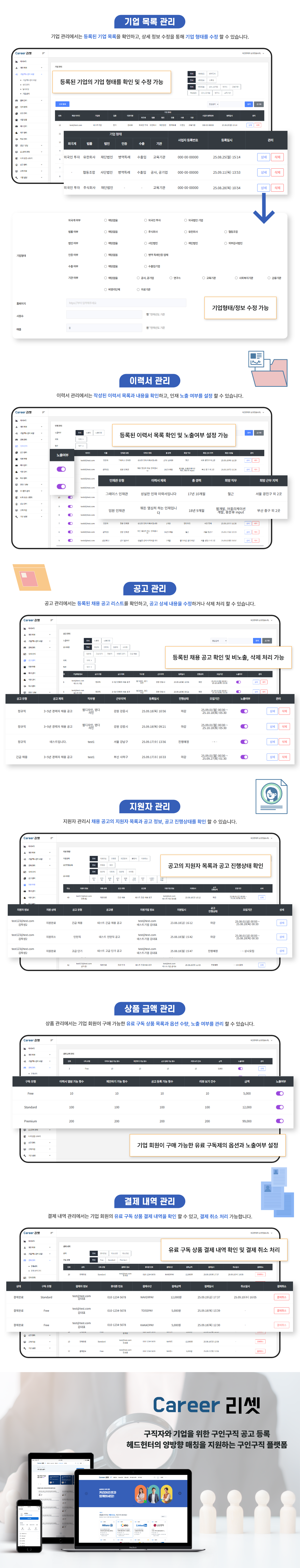 구직자(개인)와 기업을 위한 채용 정보를 제공하며, 헤드헌터를 통한 양방향 매칭 서비스를 지원하는 통합 채용 플랫폼입니다.