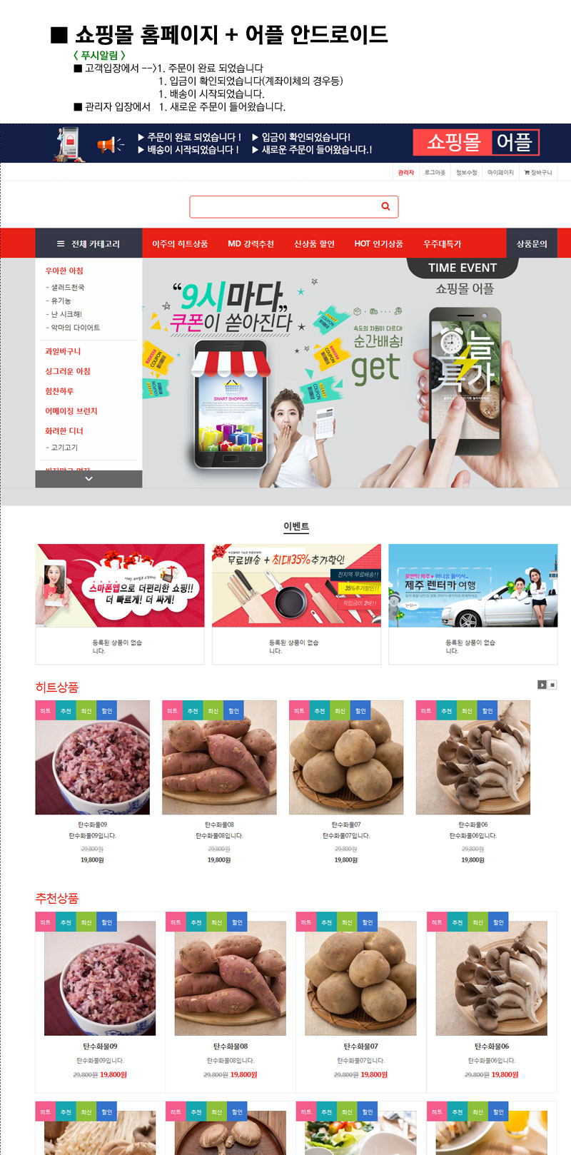 쇼핑/판매 | 쇼핑몰 어플 페이지 정보 작성자 최고관리자 작성일23-08-07 09:35 조회7,655회 댓글0건 관련링크 사이트 바로가기 : http://dmonster759.cafe24.com 이전글 다음글 목록 본문 쇼핑몰 어플입니다. 쇼핑몰 홈페이지 + 안드로이드 어플 + IOS 어플 입니다. <고객입장에서>1. 주문이 완료 되었습니다1. 입금이 확인되었습니다(계좌이체의 경우등)1. 배송이 시작되었습니다.<관리자 입장에서>1. 새로운 주문이 들어왔습니다. 이전글 다음글 목록